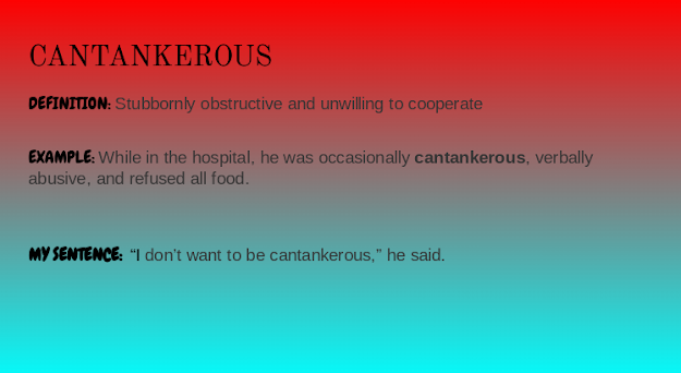 Today I am going to tell you about my word of the week and the word was Cantankerous. Here is the work that I did. This was a new word for me. We have been learning about Cantankerous.